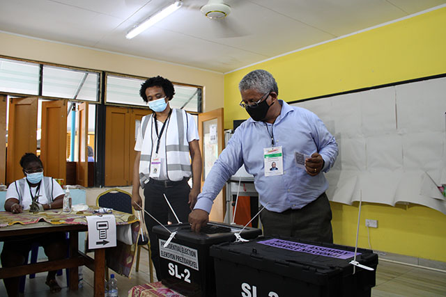 La première personne à voter, c’était le président Danny Faure qui a voté dans son district de Beau Vallon dans le nord . (Rassin Vannier, Seychelles News Agency) Photo License: CC-BY |